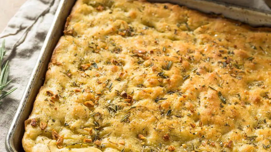 - Place the baking tray in the preheated oven and bake the focaccia for the amount of time specified in the recipe, or until the bread is golden brown and sounds hollow when tapped on the bottom.